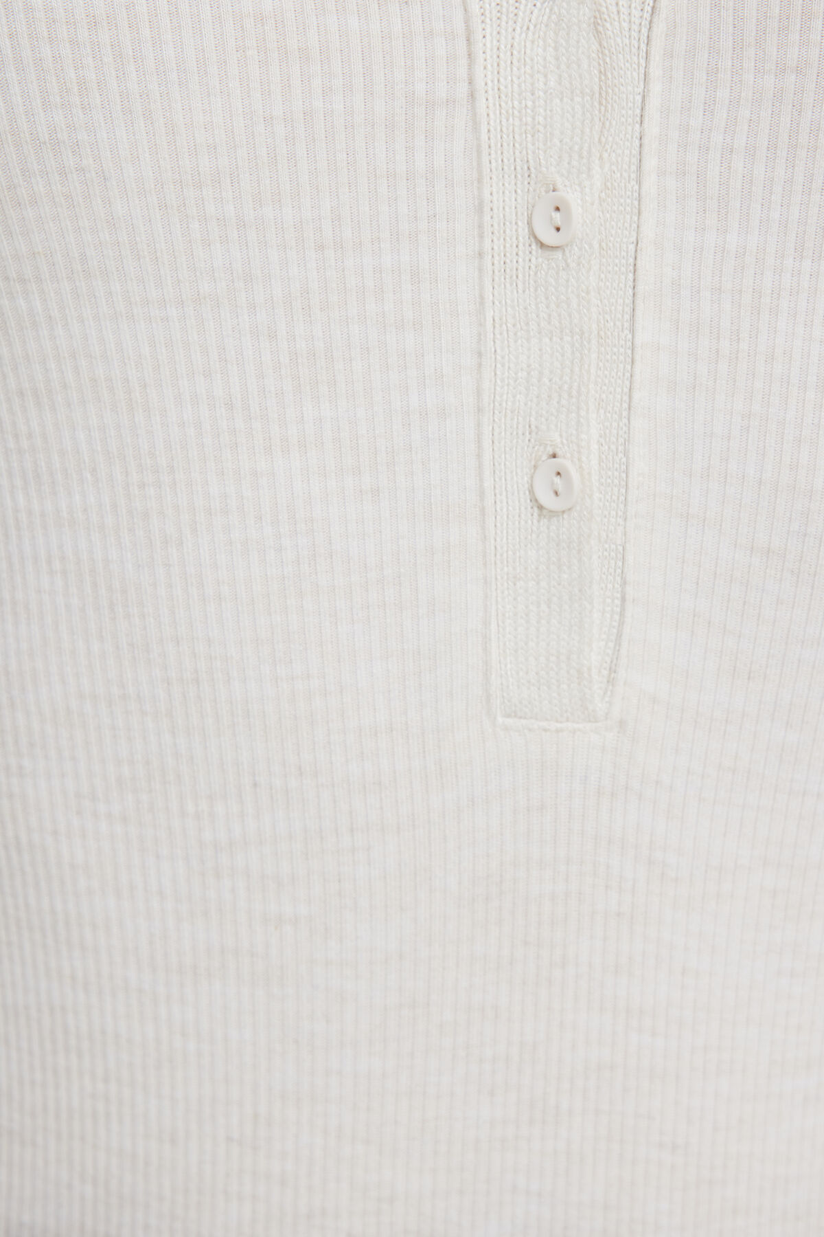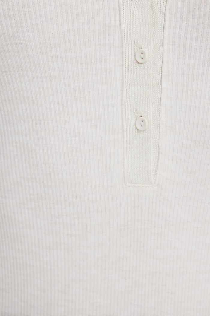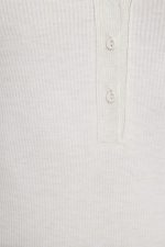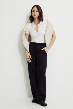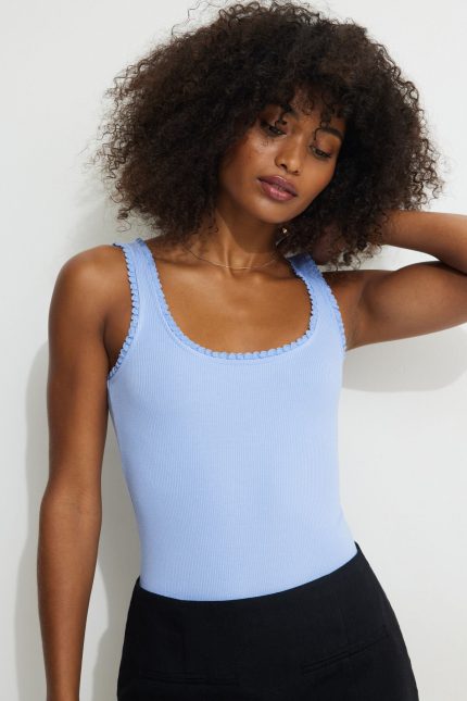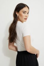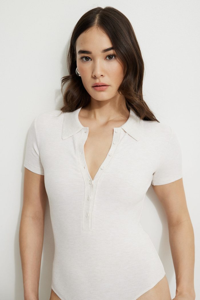 This rib knit bodysuit is designed to have a fitted silhouette. Style it with pants for a professional look.